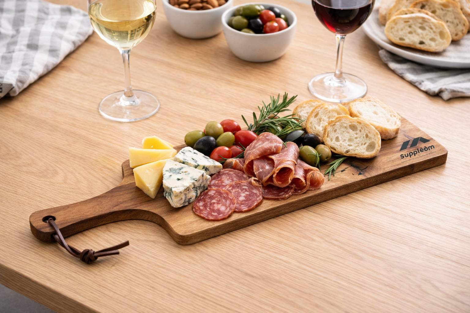 Planche de service en bois d’acacia avec poignée et cordon en PU. Format 38,5 × 11 × 0,9 cm, idéale pour la présentation de fromages et tapas.